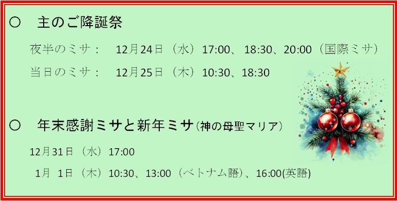2025年12月19日お知らせ お知らせ 2025年12月21日 ◆ 司牧評議会 12月の司牧評議会を、12月21日(日)12時30分から信徒会館小ホールで行います。委員の方はご出席をお願いします。 ◆ 日曜学校クリスマス会のご案内 12月21日(日)は日曜学校のクリスマス会です。子どもたちが演じるキリストご降誕のお芝居を一般公開いたします。お芝居は、信徒会館大ホールにて、11:30から始まります。どうぞお立ち寄りください。 ◆ 経済評議会 12月27日(土)15時から信徒会館中ホールで経済評議会を行います。関係者の方はご出席をお願いします。 ◆ 講座の冬休みのお知らせ 吉祥寺教会のすべての講座は、下記の期間冬期休講となります。 休講期間: 2025年12月22日(月) ~ 2026年1月19日(月) ◆ 信徒会館および事務室の休みのお知らせ 12月29日(月)から2026年1月6日(火)まで信徒会館と事務室はお休みです。 ◆ 駐車場保守工事のお知らせ 1月8日(火)、聖堂裏のタイム… 続きを読む