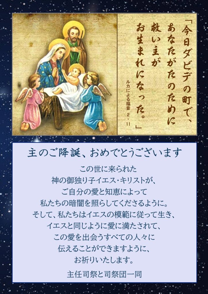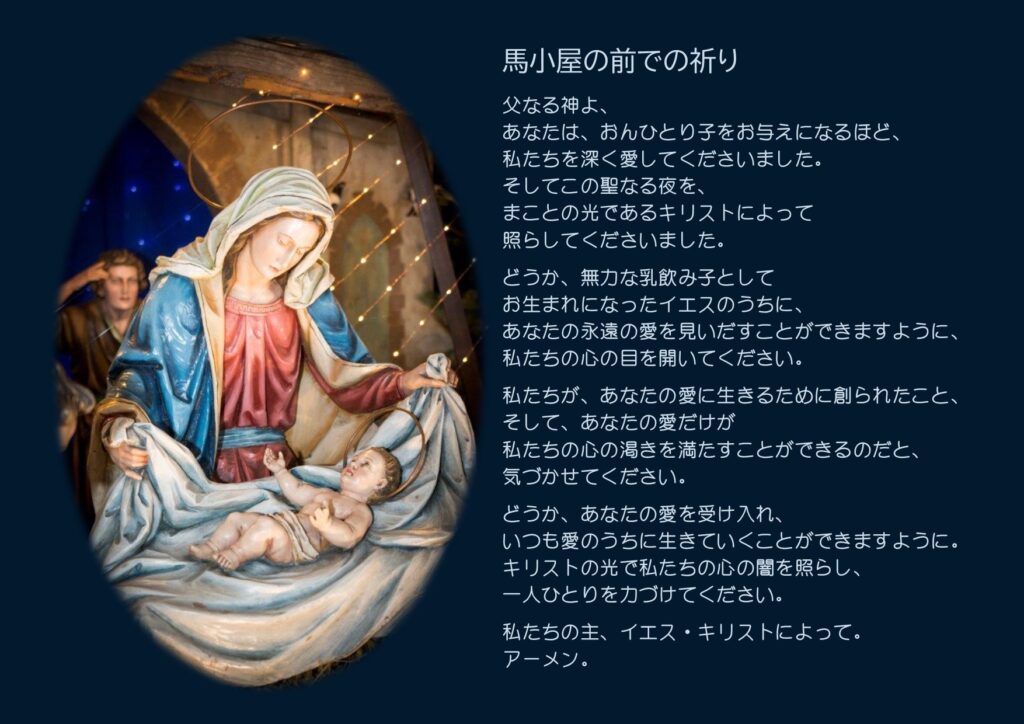 いつくしみ深い神よ、私たちは喜びのうちに新年を迎え、感謝の心でいっぱいです。過ぎ去った年のいたらなかった点を反省し、また、いただいたお恵みを感謝します。
